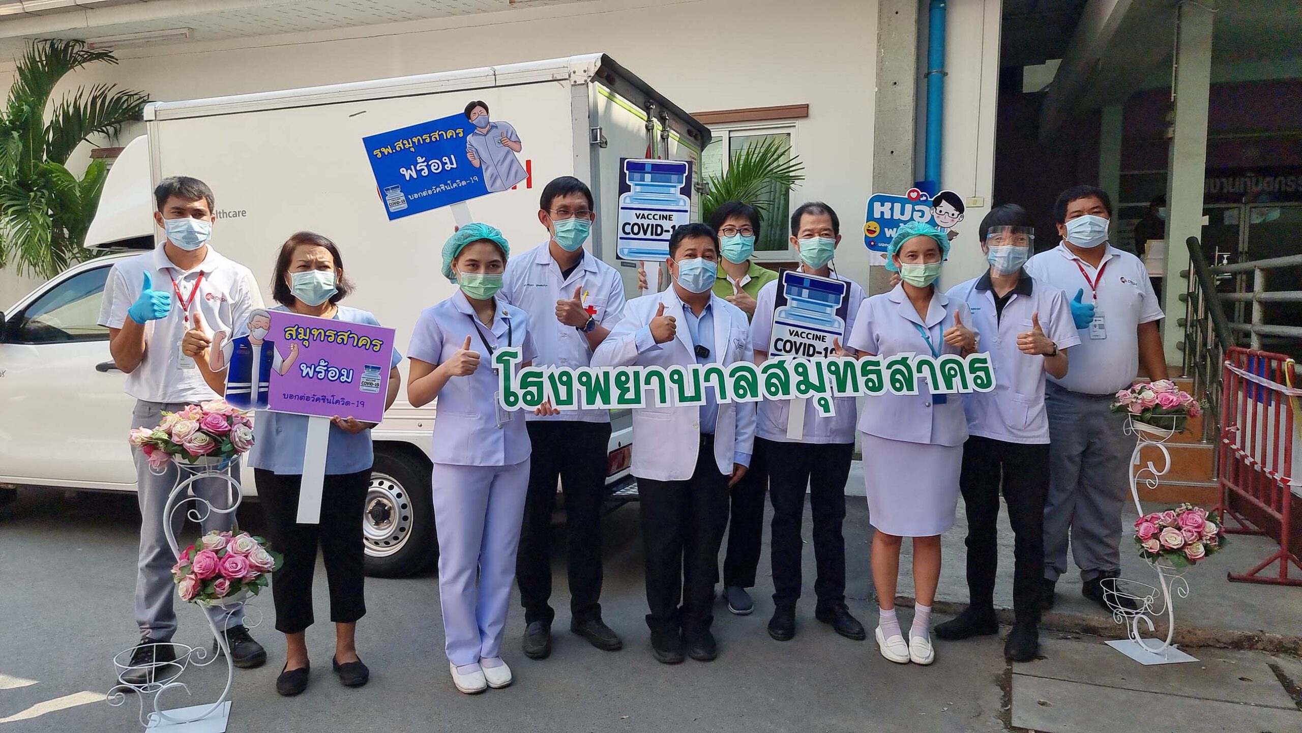 เมื่อเวลา 10.09 น.ของวันที่ 27 กุมภาพันธ์2564 รถตู้เก็บความเย็นของบริษัทเอกชน ซึ่งได้รับมอบหมายจากกระทรวงสาธารณสุข ได้นำวัคซีนโควิด 19 ล๊อตแรก ยี่ห้อ SINOVAC จำนวน 20,040 โด๊ส มาส่งมอบให้กับโรงพยาบาลสมุทรสาคร โดยมี นายแพทย์ธนพัฒน์ พวงเพชร นายแพทย์ชำนาญการ รองผู้อำนวยการด้านพัฒนาระบบบริการสุขภาพ โรงพยาบาลสมุทรสาคร เป็นผู้รับมอบ พร้อมด้วยทีมแพทย์ พยาบาล และเภสัชกร โดยวัคซีนทั้งหมดนี้เมื่อมาถึงโรงพยาบาลสมุทรสาครแล้ว ก็ถูกนำไปเก็บไว้ที่คลังเวชภัณฑ์ กลุ่มงานเภสัชกรรม เพื่อตรวจนับแล้วรีบนำเข้าตู้แช่เย็นในอุณหภูมิ 2 – 8 องศาเซลเซียส และมีการรายงานอุณหภูมิผ่านระบบออนไลน์ทุก 20 นาที สำหรับในส่วนที่เหลือจะทยอยตามมาในล็อตต่อไป จนครบตามจำนวนที่โรงพยาบาลสมุทรสาครได้รับมอบทั้งหมดประมาณ 25,000 โด๊ส