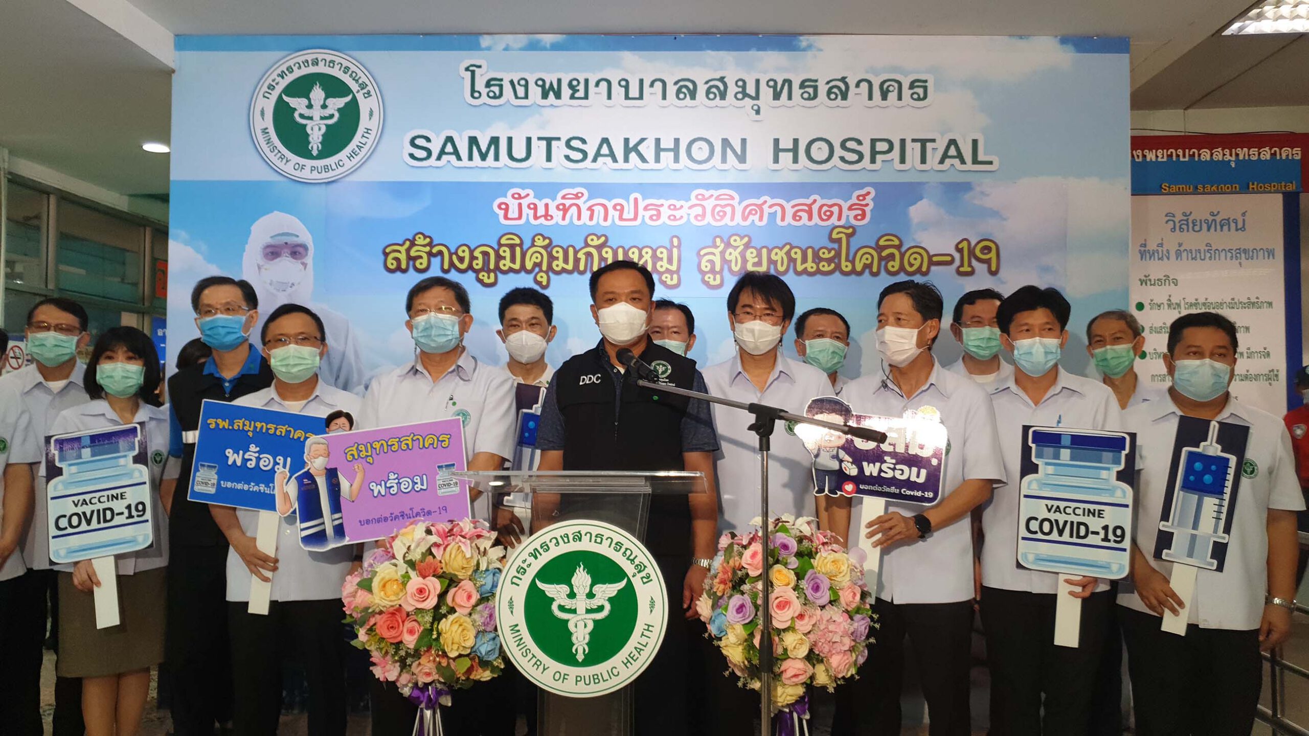 นายอนุทิน ชาญวีรกูล รองนายกรัฐมนตรีและรัฐมนตรีว่าการกระทรวงสาธารณสุข กล่าวว่า วันนี้ตนพร้อมผู้บริหารกระทรวงสาธารณสุขภายหลังจากที่ฉีดวัคซีนโควิด 19 แล้วนั้น ก็ได้มาสังเกตการณ์และให้กำลังใจผู้ที่จะได้รับวัคซีนป้องกันโควิด-19 ในจังหวัดสมุทรสาคร ซึ่งถือว่าเป็นชุดแรก หรือชุดนำร่องในพื้นที่จังหวัดเป้าหมาย โดยทางจังหวัดสมุทรสาครมีความจำเป็นที่จะต้องได้รับการให้บริการวัคซีน เพื่อทำให้มั่นใจว่าเราสามารถควบคุม การแพร่ระบาดของเชื้อโรคโควิด-19ได้ วัคซีนที่ได้นำมาฉีดให้กับจังหวัดสมุทรสาครในล๊อตแรกนี้ เป็นวัคซีนยี่ห้อซิโนแวค ผลิตในประเทศจีน เป็นวัคซีนที่มาเป็นล๊อตแรกจำนวน 200,000 โด๊ส ซึ่งแม้จะเกิดวิกฤติที่ไม่มีใครอยากให้เกิด แต่วิกฤติของจังหวัดสมุทรสาคร ก็นับเป็นโอกาสและเหตุผลหลักที่ทำให้ประเทศไทยต้องรีบจัดหาวัคซีนซิโนแวคจากจีนเข้ามา เพื่อรองรับสถานการณ์ เพื่อหยุดยั้งการแพร่กระจายของโรคในขั้นต้น โดยหลังจากนี้ในเดือนมีนาคมก็จะมีวัคซีนซิโนแวคเข้ามาอีก 8 แสนโด๊ส และในเดือนเมษายนอีก 1 ล้านโด๊ส ส่วนวัคซีนแอสตราเซเนกาที่ผลิตในประเทศไทย ตามที่ได้รับรายงานทราบว่า ขั้นตอนหรือกระบวนการผลิตเป็นไปตามที่คาดหมายทุกประการ และมีบางประเด็นที่ดีกว่าการคาดหมาย