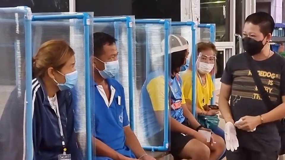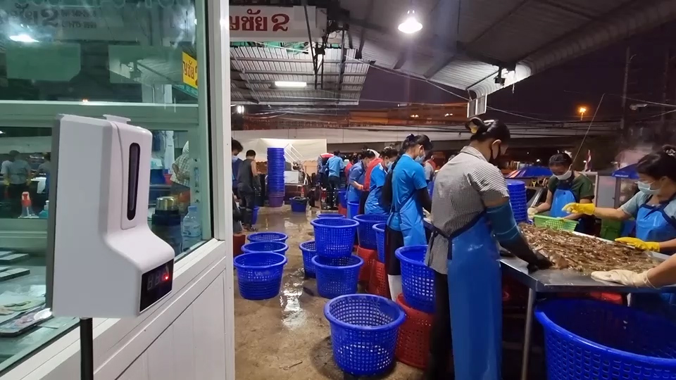 โดยเมื่อรถบรรทุกสินค้าสัตว์น้ำ หรือรถผู้มาซื้อขายทุกคัน ที่จะเข้าในตลาดกลางกุ้ง จะต้องผ่านด่านตรงจุดคัดกรองก่อน มีทั้งการตรวจวัดอุณหภูมิร่างกาย ตรวจรับรองแพทย์ว่าได้ผ่านการตรวจโควิด – 19 แล้ว ยกเว้นในส่วนของผู้ประกอบการที่เป็นสมาชิกของตลาดกลางกุ้ง ซึ่งได้รับการออกบัตรรับรองตามมาตรการของตลาดเป็นที่เรียบร้อยแล้ว ก็ไม่ต้องมีใบรับรองแพทย์มาแสดง ขณะที่ทางด้านแรงงานข้ามชาติที่มาทำงานในแพกุ้ง แพปลานั้น ก็จะต้องสวมแมส และใส่อุปกรณ์ป้องกัน เช่น ถุงมือ รองเท้าบู๊ท ผ้ายางกันเปื้อน ตามมาตรการที่สาธารณสุขกำหนด ด้านผู้มารอซื้อ หรือนำกุ้งจากบ่อมาขายที่แพ หากยังไม่ถึงคิว ก็จะต้องนั่งรอในบริเวณพื้นที่ๆ จัดเตรียมไว้ โดยจะมีการใช้ฉากกั้นเป็นช่องๆ เพื่อเว้นระยะห่างระหว่างกัน