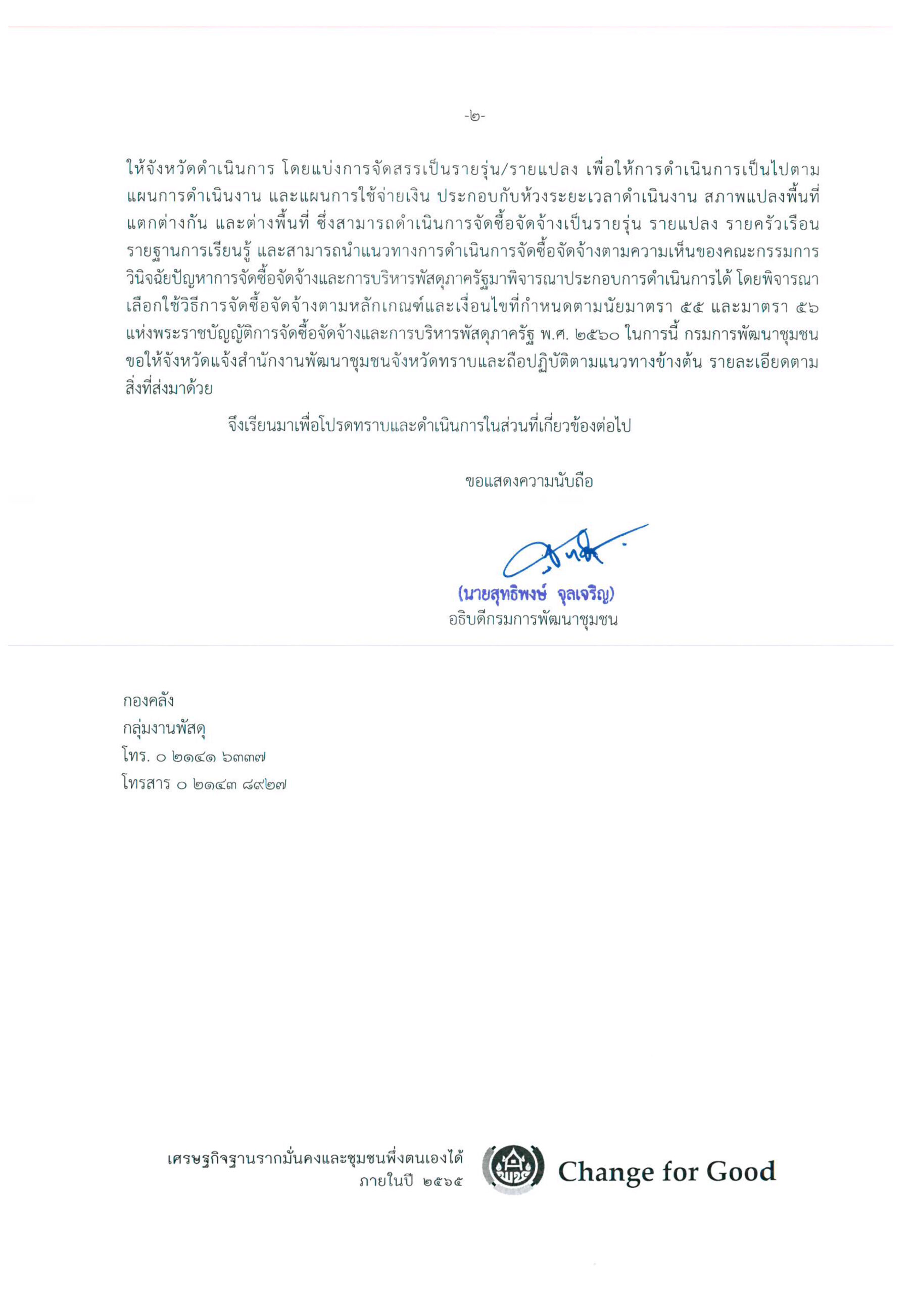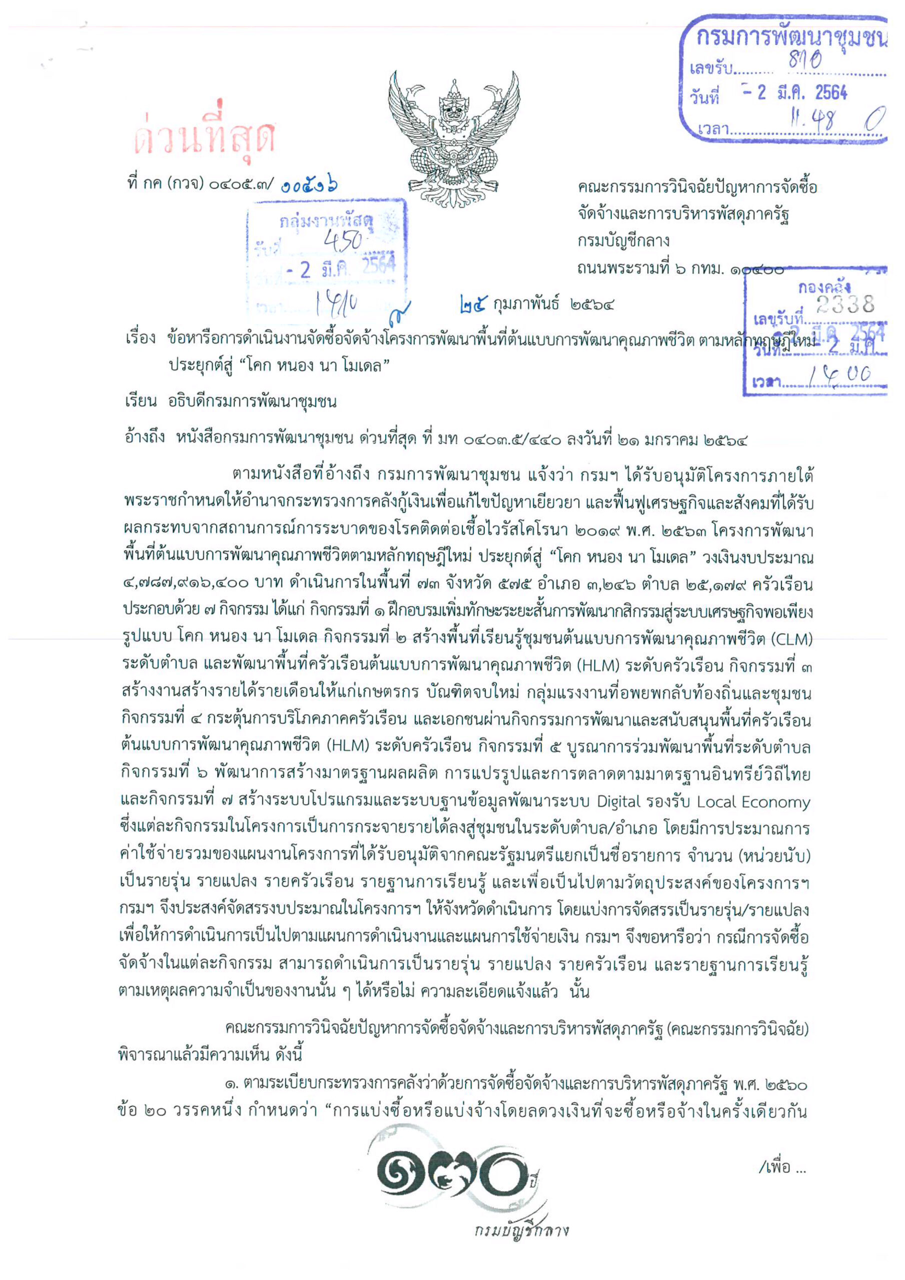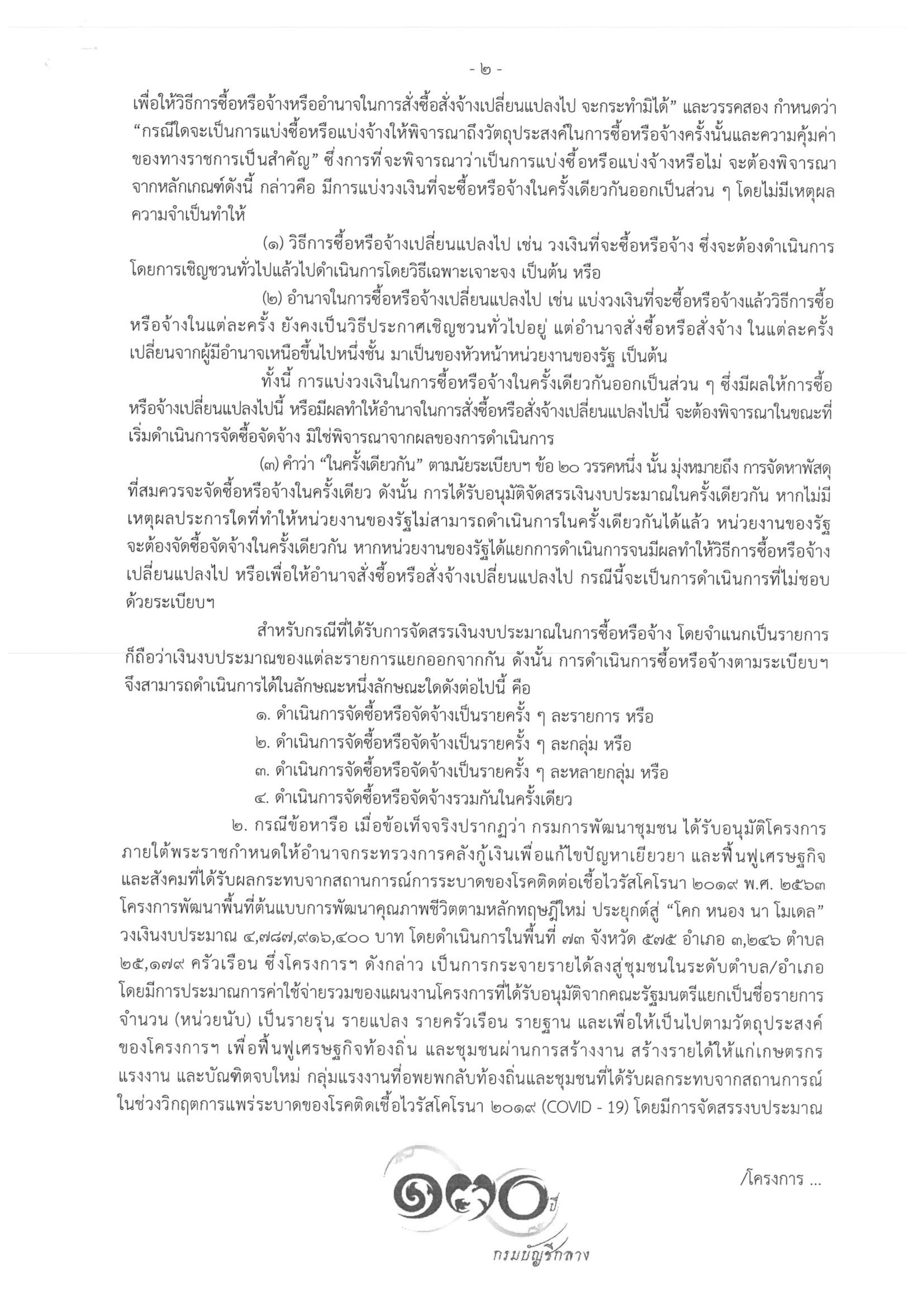 การดำเนินโครงการฯ ดังกล่าว ถือเป็นการกระจายรายได้ลงสู่ชุมชน ในระดับตำบล/อำเภอ โดยมีการประมาณการค่าใช้จ่ายรวมของแผนงานโครงการที่ได้รับอนุมัติจากคณะรัฐมนตรีแยกเป็นชื่อรายการ จำนวน (หน่วยนับ) เป็นรายรุ่น รายแปลง รายครัวเรือน รายฐาน และเพื่อให้เป็นไปตามวัตถุประสงค์ของโครงการฯ เพื่อฟื้นฟูเศรษฐกิจท้องถิ่น และชุมชนผ่านการสร้างงาน สร้างรายได้ให้แก่เกษตรกร แรงงาน และบัณฑิตจบใหม่ กลุ่มแรงงานที่อพยพกลับท้องถิ่นและชุมชนที่ได้รับผลกระทบจากสถานการณ์ในช่วงวิกฤตการแพร่ระบาดของโรคติดเชื้อไวรัสโคโรนา ๒๐๑๙ (COVID-19) โดยมีการจัดสรรงบประมาณโครงการฯ ให้จังหวัดดำเนินการ แบ่งการจัดสรรเป็นรายรุ่น/รายแปลง เพื่อให้การดำเนินการเป็นไปตามแผนการดำเนินงาน และแผนการใช้จ่ายเงิน ประกอบกับห้วงระยะเวลาดำเนินงาน สภาพแปลงพื้นที่แตกต่างกัน และต่างพื้นที่ ดังนั้น กรณีนี้กรมการพัฒนาชุมชนย่อมสามารถดำเนินการจัดซื้อจัดจ้างเป็นรายรุ่น รายแปลง รายครัวเรือน รายฐานการเรียนรู้ และสามารถนำแนวทางการดำเนินการจัดซื้อจัดจ้างตามความเห็นของคณะกรรมการวินิจฉัยปัญหาการจัดซื้อจัดจ้างและการบริหารพัสดุภาครัฐมาพิจารณาประกอบการดำเนินการได้ โดยพิจารณาเลือกใช้วิธีการจัดซื้อจัดจ้างตามหลักเกณฑ์และเงื่อนไขที่กำหนดตามนัยมาตรา ๕๕ และมาตรา ๕๖ แห่งพระราชบัญญัติการจัดซื้อจัดจ้างและการบริหารพัสดุภาครัฐ พ.ศ. ๒๕๖๐