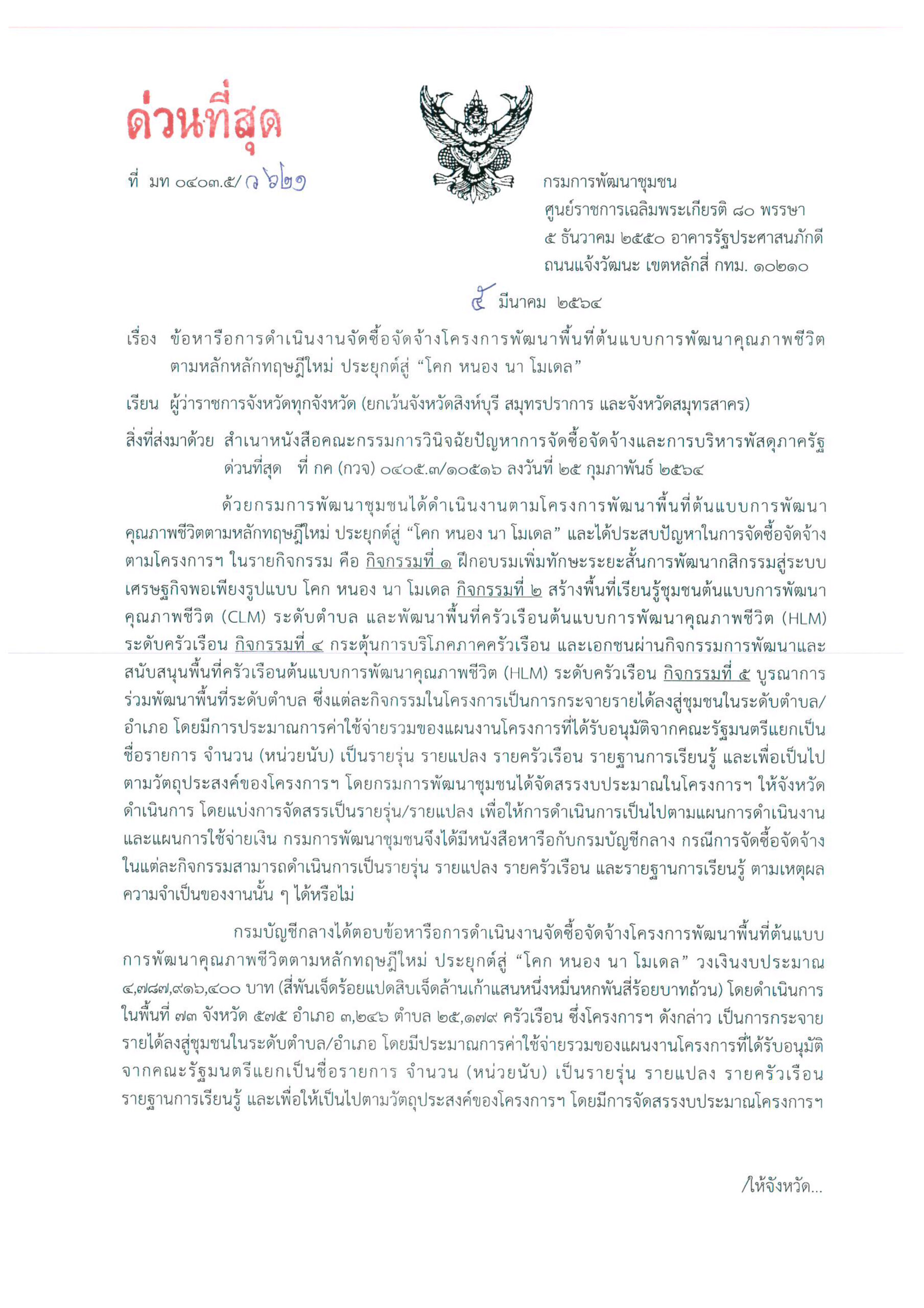 โดยดำเนินการในพื้นที่ ๗๓ จังหวัด ๕๗๕ อำเภอ ๓,๒๔๖ ตำบล ๒๕,๑๗๙ ครัวเรือน กรมการพัฒนาชุมชนได้ดำเนินงานตามโครงการพัฒนาพื้นที่ต้นแบบการพัฒนา คุณภาพชีวิตตามหลักทฤษฎีใหม่ ประยุกต์สู่ “โคก หนอง นา โมเดล” มาระยะหนึ่ง และได้พบประเด็นปัญหาในการจัดซื้อจัดจ้างตามโครงการฯ ในรายกิจกรรม คือ กิจกรรมที่ ๑ ฝึกอบรมเพิ่มทักษะระยะสั้นการพัฒนากสิกรรมสู่ระบบเศรษฐกิจพอเพียงรูปแบบ โคก หนอง นา โมเดล กิจกรรมที่ ๒ สร้างพื้นที่เรียนรู้ชุมชนต้นแบบการพัฒนาคุณภาพชีวิต (CLM) ระดับตำบล และพัฒนาพื้นที่ครัวเรือนต้นแบบการพัฒนาคุณภาพชีวิต (HLM) ระดับครัวเรือน กิจกรรมที่ ๔ กระตุ้นการบริโภคภาคครัวเรือน และเอกชนผ่านกิจกรรมการพัฒนาและสนับสนุนพื้นที่ครัวเรือนต้นแบบการพัฒนาคุณภาพชีวิต (HLM) ระดับครัวเรือน กิจกรรมที่ ๕ บูรณาการร่วมพัฒนาพื้นที่ระดับตำบล