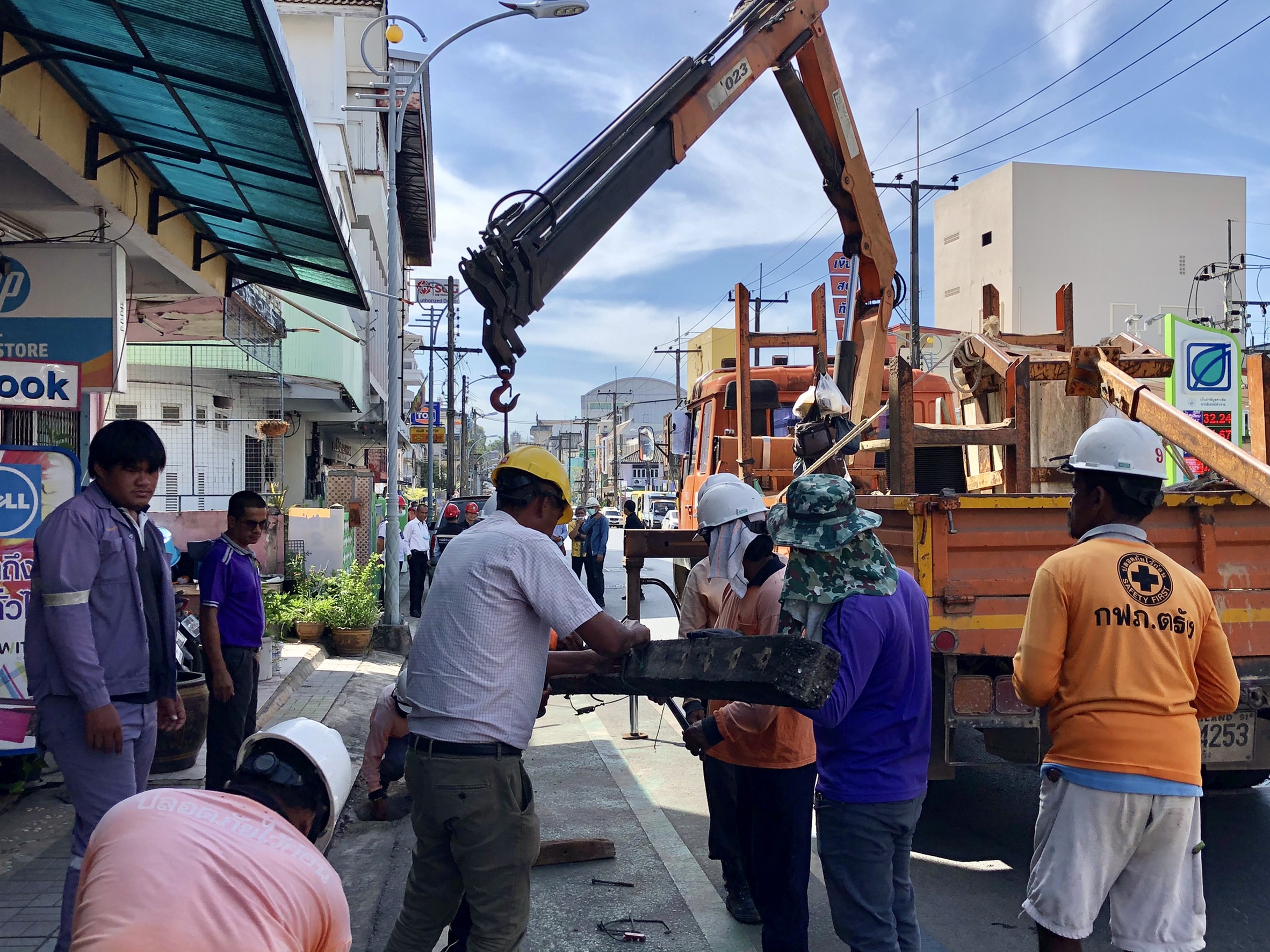 นายสมมาศ พุฒิพงศกร ผู้จัดการการไฟฟ้าส่วนภูมิภาคจังหวัดตรัง นำทีมผู้บริหาร พนักงาน PEA ดำเนินการปรับปรุงระบบจำหน่ายเพื่อรองรับการจ่ายไฟระบบเคเบิลใต้ดิน ถนนวิเศษกุล อำเภอเมือง จังหวัดตรัง ตามบันทึกข้อตกลง Memorandum of Agreement (MOA) ระหว่าง การไฟฟ้าส่วนภูมิภาคกับเทศบาลนครตรัง โดยมีนายวัลลภ ช่วยบำรุง ปลัดเทศบาลนครตรัง ร่วมแผนรื้อถอนเสา สายไฟฟ้าและอุปกรณ์ประกอบ
