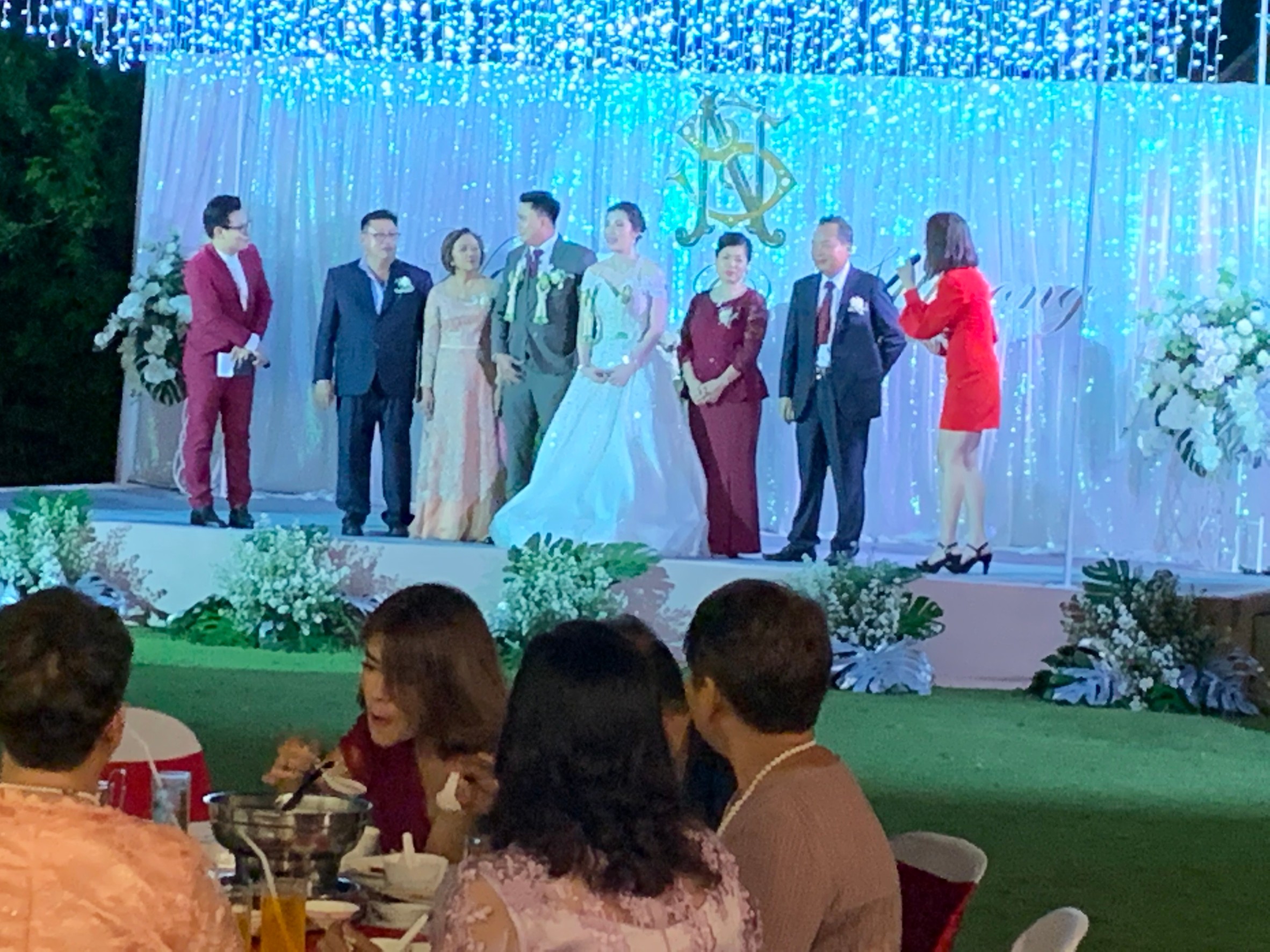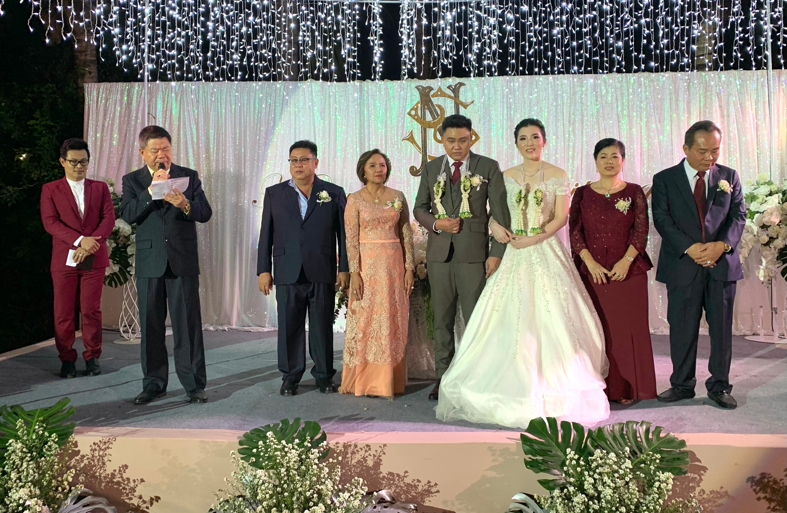 (อดีตรองผู้ว่าราชการจังหวัดร้อยเอ็ด) พร้อมภริยาให้เกียรติสวมมาลัยมงคล และกล่าวอวยพรให้คู่บ่าวสาว ระหว่าง นางสาว นาราริน ตั้งดำรงค์ชัย บุตรี