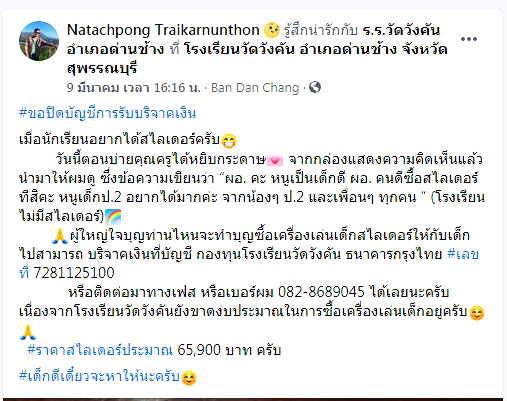 ในโพสต์มีข้อความผู้ใหญ่ใจบุญท่านไหนจะทำบุญซื้อเครื่องเล่นสไลเดอร์ให้กับเด็กสามารถบริจาคเงินที่บัญชีกองทุนโรงเรียนวัดวังคัน ธนาคารกรุงไทย เลขที่ 7281125100 หรือติดต่อทางเฟสหรือเบอร์ 082-8689045 ได้เลยนะครับเนื่องจากโรงเรียนวัดวังคัน ยังขาดงบประมาณในการซื้อเครื่องเล่นเด็กอยู่ครับ ราคาสไลเดอร์ประมาณ 65,900 บาทครับ โพสต์ดังกล่าวสร้างความฮือฮาและได้รับความสนใจจากสมาชิกและผู้ใจบุญร่วมกันบริจาคเงินเข้าบัญชีเป็นจำนวนมาก