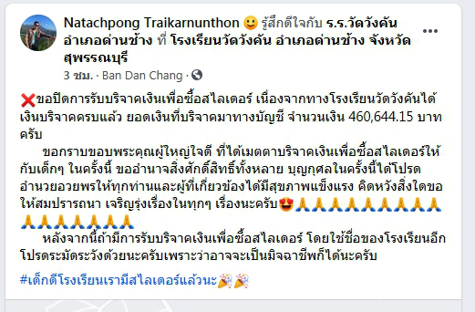 ผู้สื่อข่าวได้ไปที่โรงเรียนวั ดวังคัน อำเภอด่านช้าง จังหวัดสุพรรณบุรี ได้สอบถามนายณธัชพงศ์ ตรัยคนันธรณ์ ผู้อำนวยการโรงเรียนวัดวังคัน เปิดเผยว่าหลังจากที่ตนได้นำจดหมายน้อยของเด็กนักเรียนชั้น ป.2 ที่อยากได้เครื่องเล่นสไลเดอร์ ไปโพสต์ในเฟสบุ๊กส่วนตัวและมีผู้ใจบุญร่วมกันบริจาคเงินเข้บัญชีกองทุนของโรงเรียนจำนวนมากพอที่จะนำไปจ่ายค่าเครื่องเล่นสไลเดอร์ แล้วจึงขอปิดบัญชีรับบริจาค ตั้งแต่ช่วงเย็นวันที่ 12 มีนาคม โดยมียอดเงินที่ผู้ใจบุญร่วมกันบริจาคจำนวน 460,644.15 บาทจึงได้ปรึกษากับคณะกรรมการบริหารสถานศึกษาและคณะครูของโรงเรียนต่างมีความเห็นว่าจำนวนเงินเพียงพอแล้วจึงปิดการรับบริจาค ต่อไปนี้จะไม่มีการขอรับบริจาคในนามกองทุนซื้อเครื่องเล่นสไลเดอร์ ในนามของโรงเรียนวัดวังคันอีก