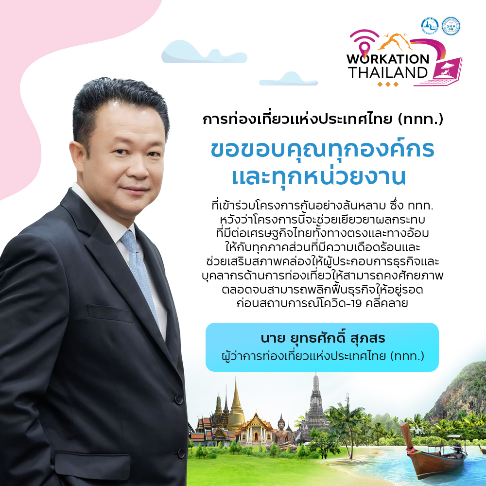 หลังจากที่การท่องเที่ยวแห่งประเทศไทย (ททท.) ได้จัดทำโครงการกระตุ้นการเดินทาง “Workation Thailand ทำงานเที่ยวได้ รวมใจช่วยชาติ” ภายใต้โครงการผู้ประกอบการสร้างสรรค์ ททท. สร้างเสริม เพื่อยกระดับคุณภาพสินค้าและการบริการทางการท่องเที่ยวของผู้ประกอบการเพื่อสร้างความมั่นใจแก่นักท่องเที่ยว และยังแสดงถึงภาพลักษณ์ของประเทศไทยที่ยังเป็นแหล่งท่องเที่ยวคุณภาพ เพื่อกระตุ้นตลาดในประเทศ แบบ Force Move Tourism โดยมีแก่นสำคัญในการสื่อสาร คือ “Workation Thailand ทำงานเที่ยวได้ รวมใจช่วยชาติ” ภายใต้แนวคิด “Working Outing & Meeting from Somewhere ความอิสระที่องค์กรและหน่วยงานสามารถเปลี่ยนทุกที่ของประเทศไทยให้กลายเป็นที่ทำงาน พบปะ พูดคุย สังสรรค์ และจัดประชุมท่ามกลางบรรยากาศที่แตกต่างไปจากเดิม” โดยเชิญชวนองค์กร และหน่วยงานต่างๆ